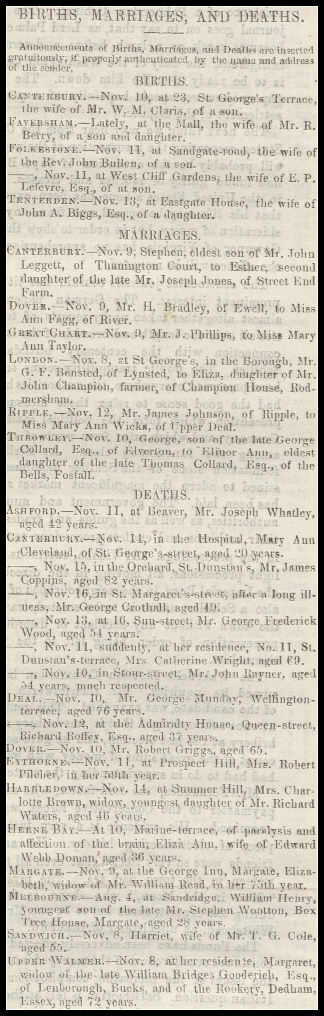 Announcement in Kentish Chronicle And General Advertiser, Canterbury, Kent, England, November 19, 1859.