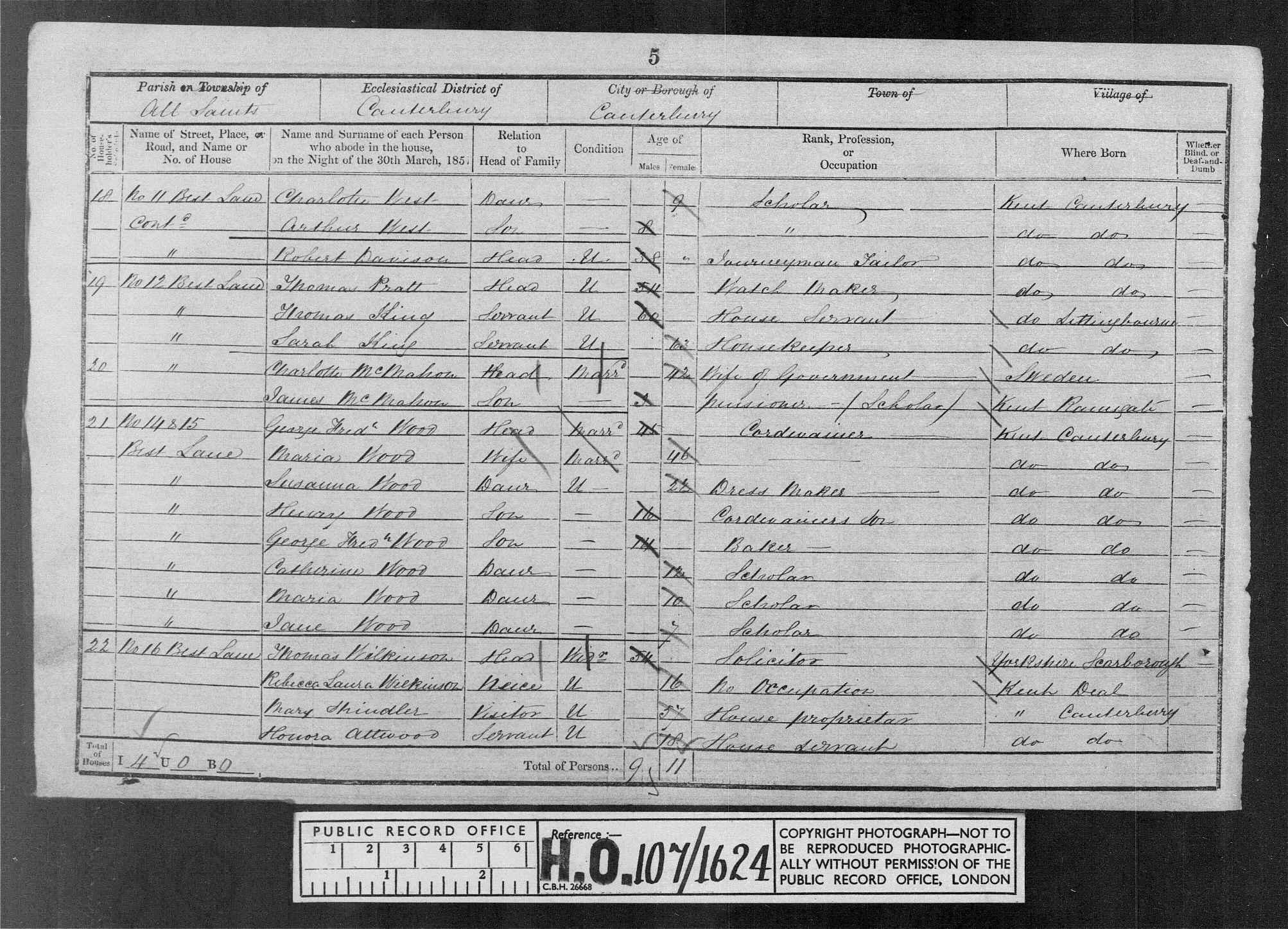 Census 1851 All Saints, Canterbury, Kent, England HO107/1624/303/5/21, (HO107/1624/303/5/21).