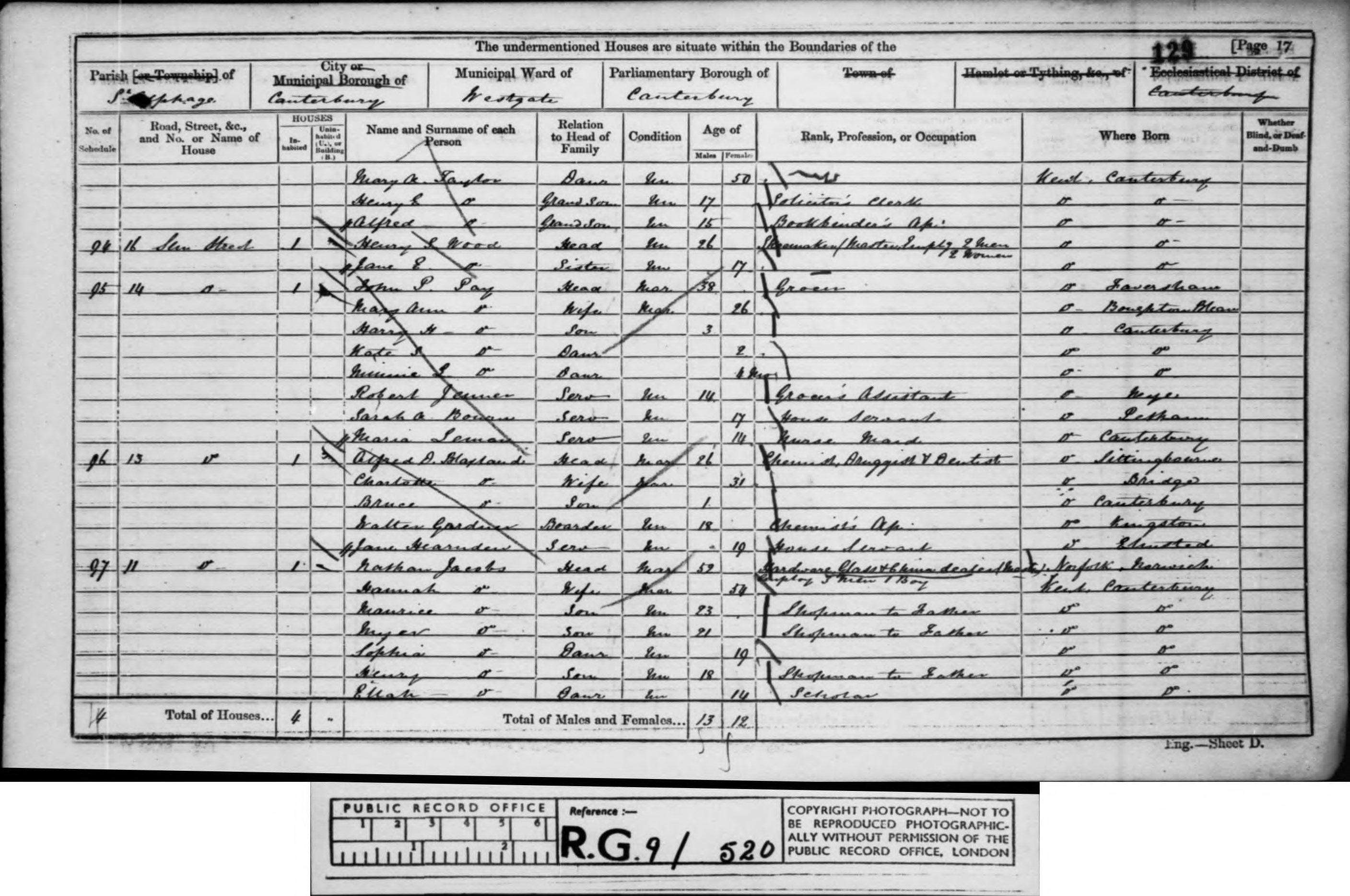 Census 1861 St Alphege, Canterbury, Kent, England RG9/520/127/17, (RG9/520/127/17).