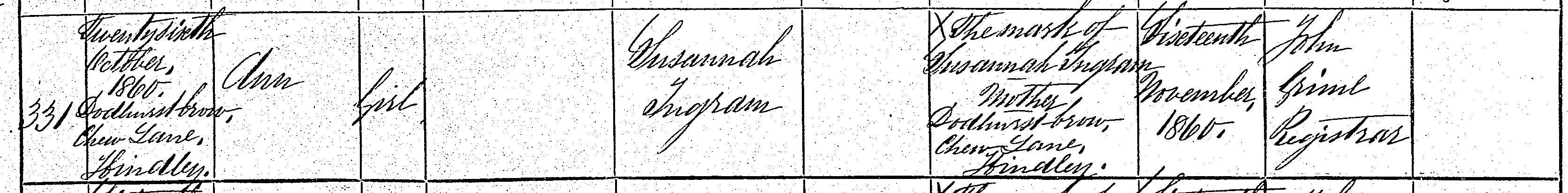 Susannah INGRAM was informant on the birth certificate for Ann INGRAM on October 26, 1860 in Hindley, Wigan, Lancashire, England3