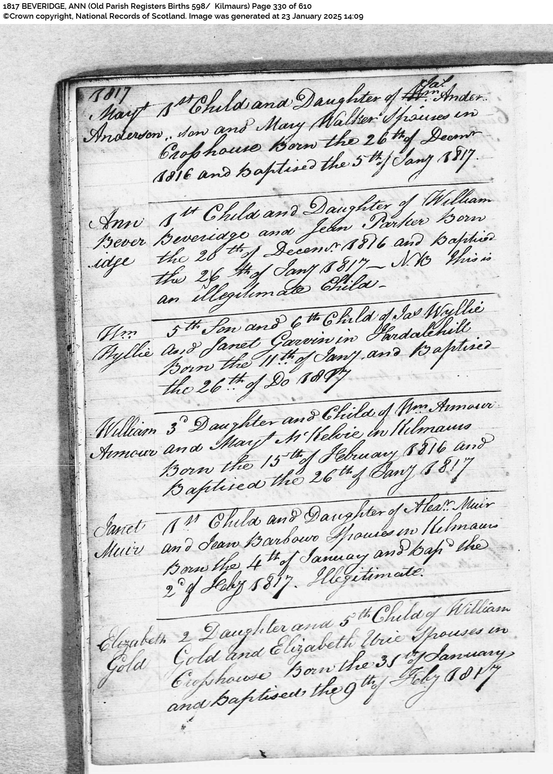 Baptism Kilmaurs, Ayrshire, Scotland 26 Jan 1817 Ann Beveridge, (OPR 598/1).