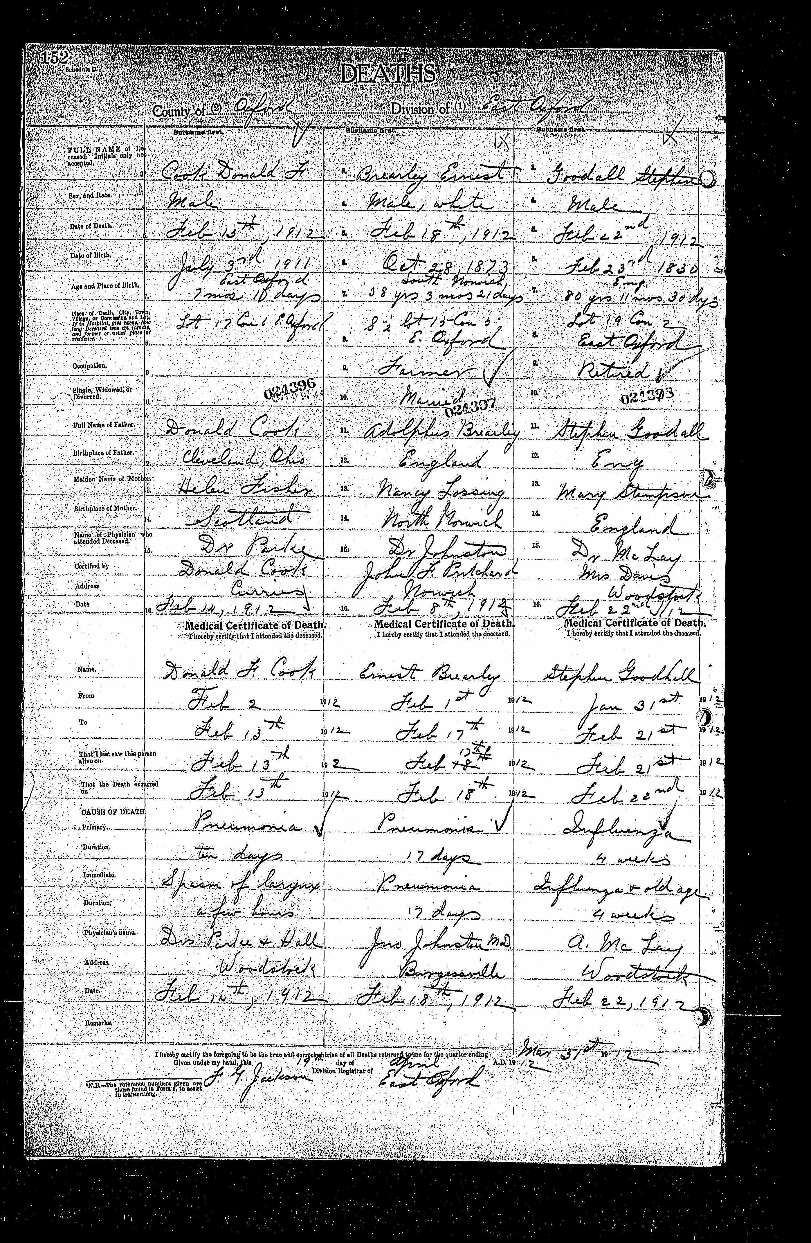 Death East Oxford Twp., Oxford County, Ontario (Lot 15, Concession 5) 18 Feb 1912 Albert Ernest Brearley.