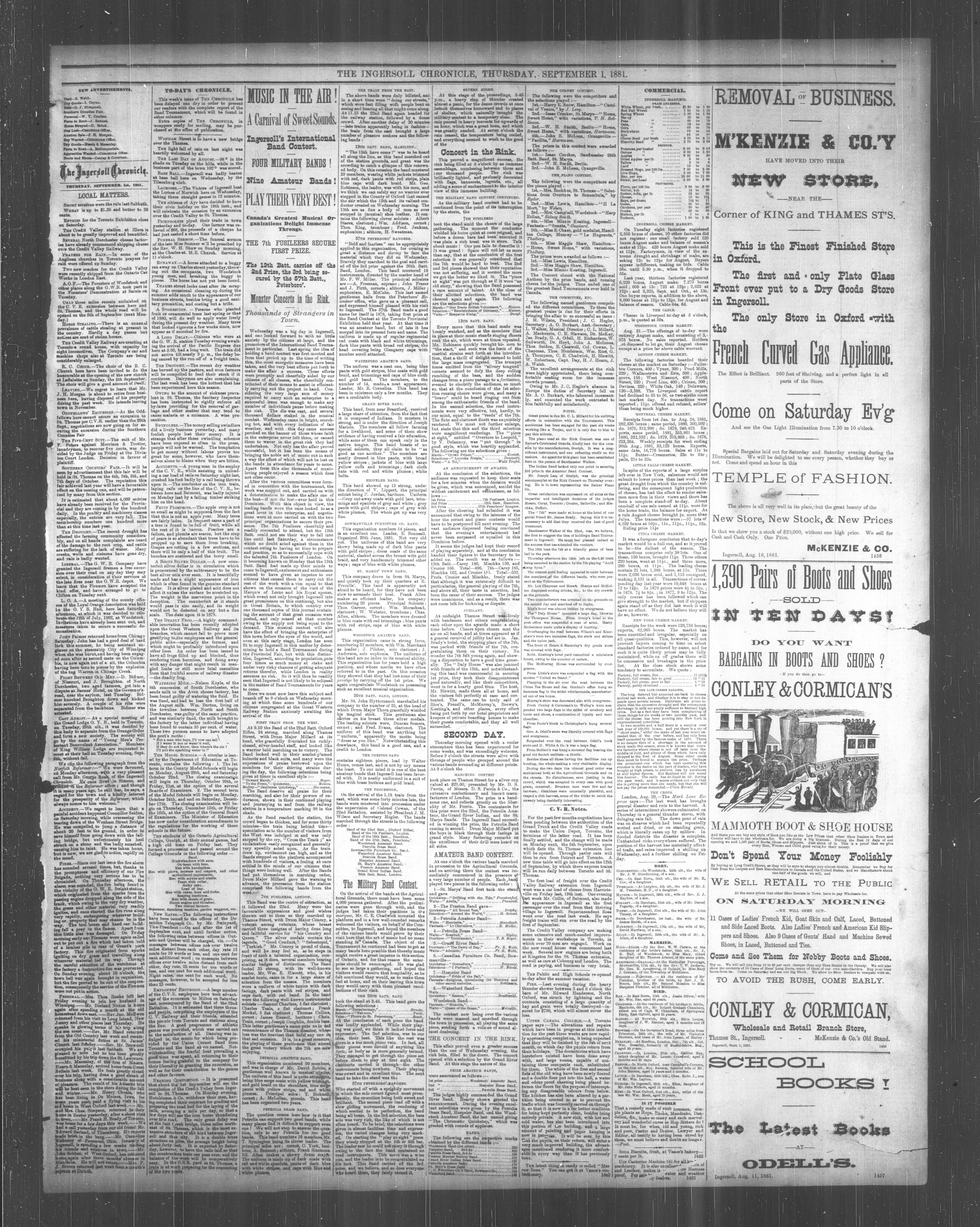 Announcement in The Ingersoll Chronicle, September 1, 1881.