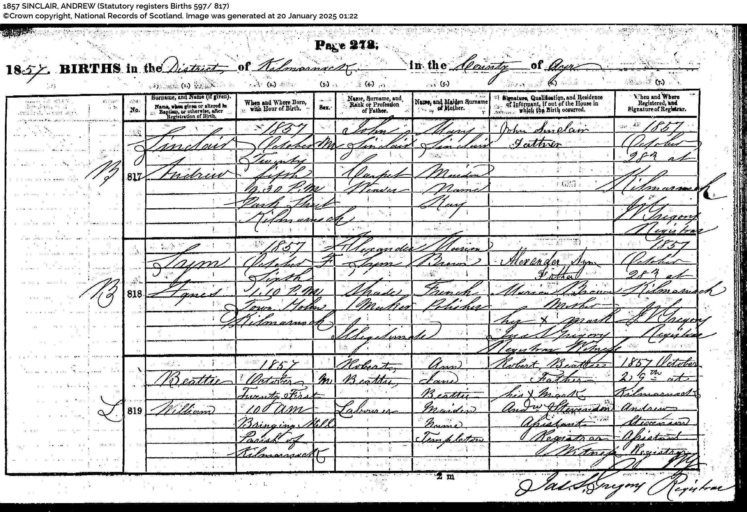 Birth Kilmarnock, Ayrshire, Scotland (Park Street, Kilmarnock) 25 Oct 1857 Andrew Sinclair.