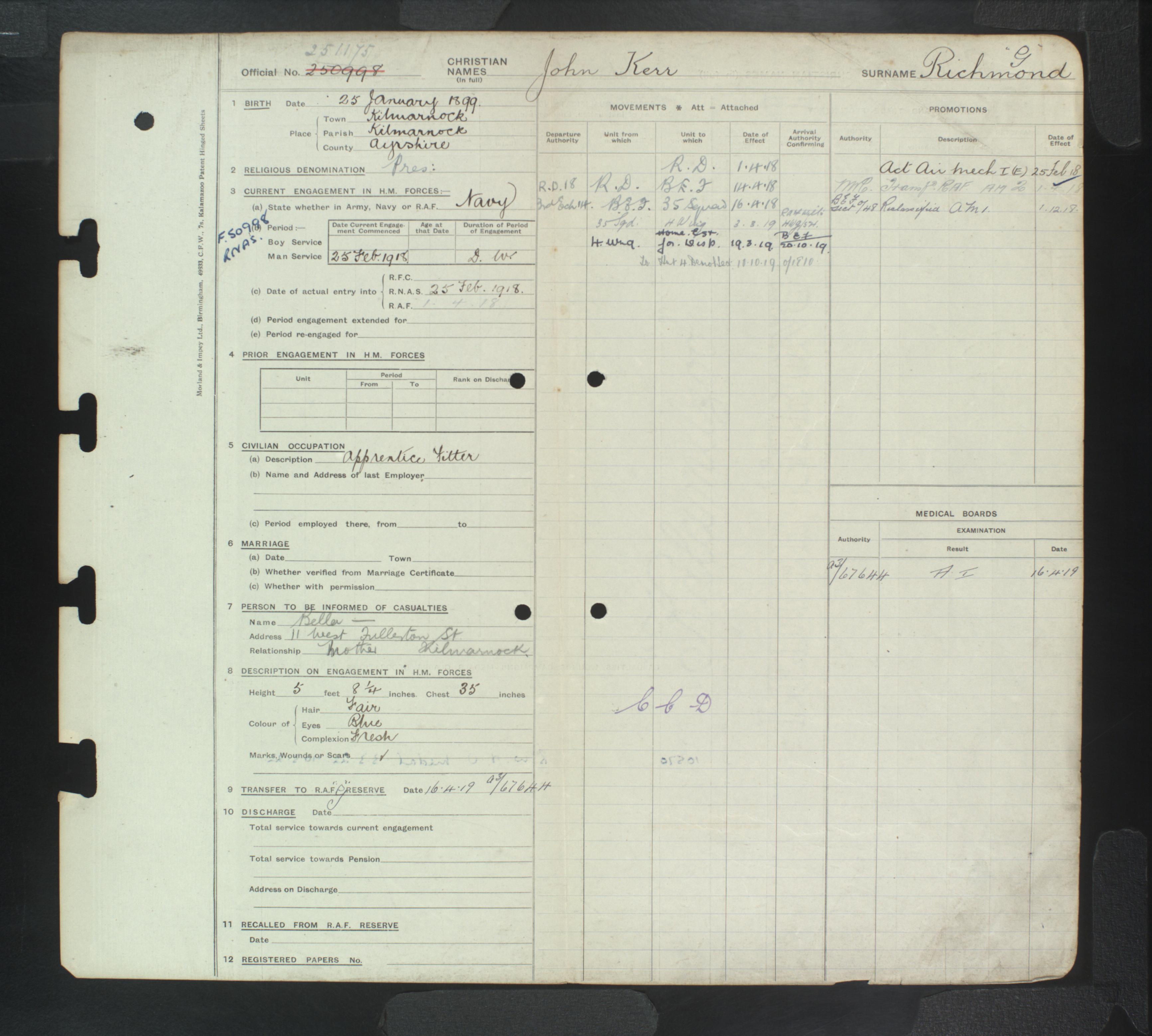 Birth Kilmarnock, Ayr, Scotland (11 West Fullerton Street, Kilmaurs) 25 Jan 1899 John Kerr Richmond.