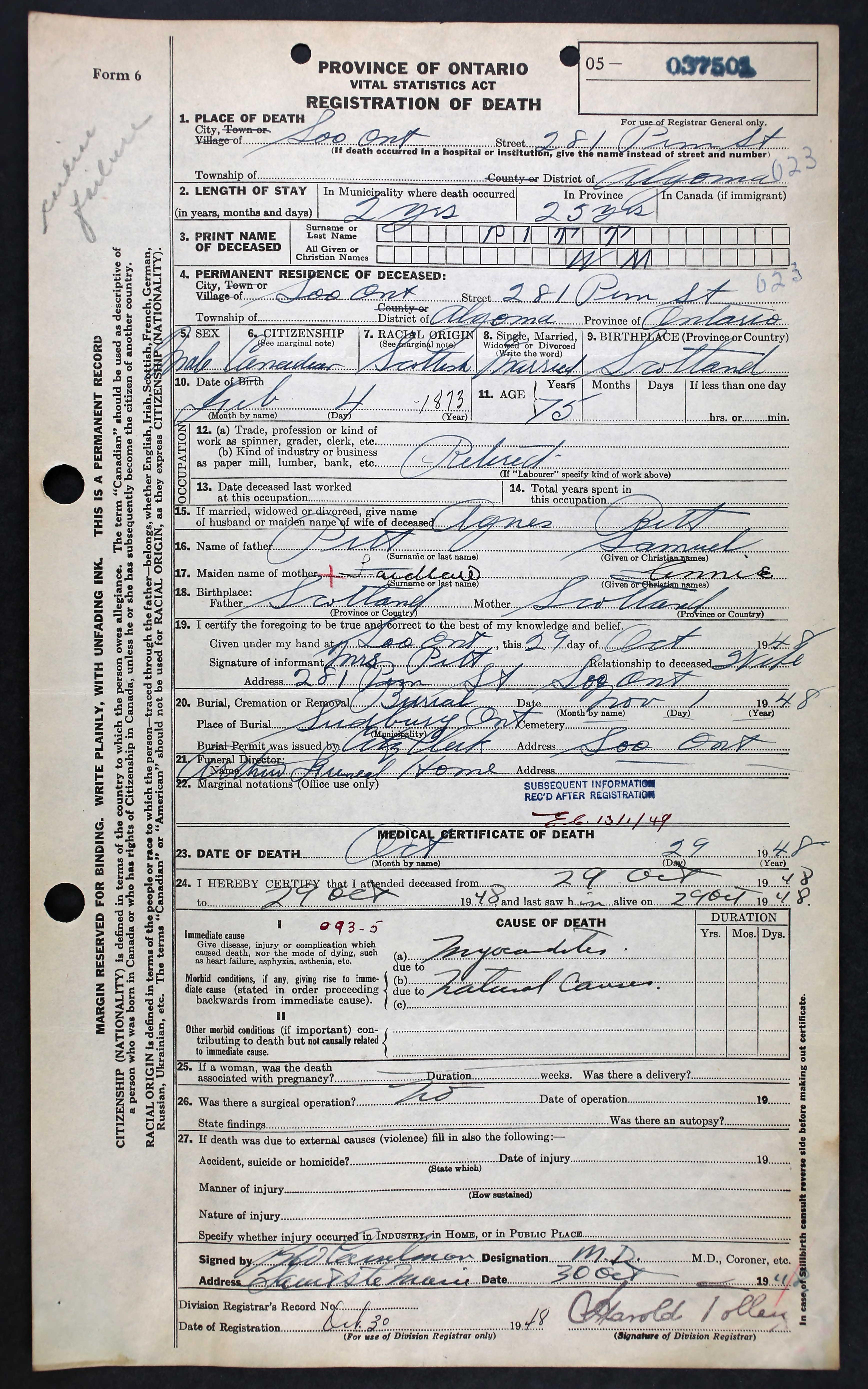 Death Sault Ste. Marie, Algoma, Ontario, Canada (281 Pim St, Sault Ste. Marie) 29 Oct 1948 William Laidlaw Pitt.